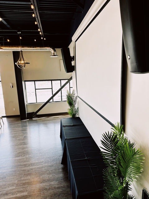 The Main Hall includes a huge 12-foot Screen, Ceiling mounted Projector, 42-inch JBL Speakers, Bluetooth capability, Microphones, and an easy to use Touch Screen Controller.